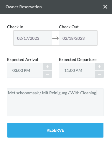 Im Kalender können Sie ganz einfach selbst eine Sperre für die eigene Nutzung hinzufügen, ändern oder entfernen. Klicken Sie dazu auf die Schaltfläche „New owner reservation (neue Reservierung Eigentümer)”. Geben Sie die richtigen Daten und die Anzahl der Personen ein. Sie können diese Buchungen später selbst ändern oder stornieren, indem Sie darauf klicken.