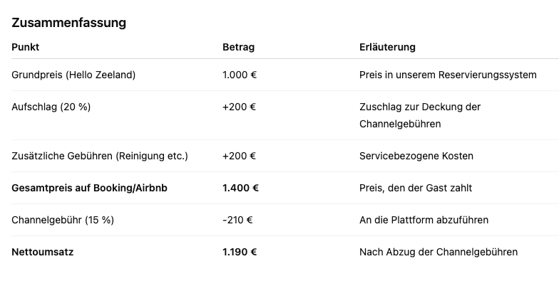 Der 20 %-Aufschlag deckt die Channelgebühren weitgehend ab, sodass der Nettoumsatz nahezu dem einer Direktbuchung über Hello Zeeland entspricht.