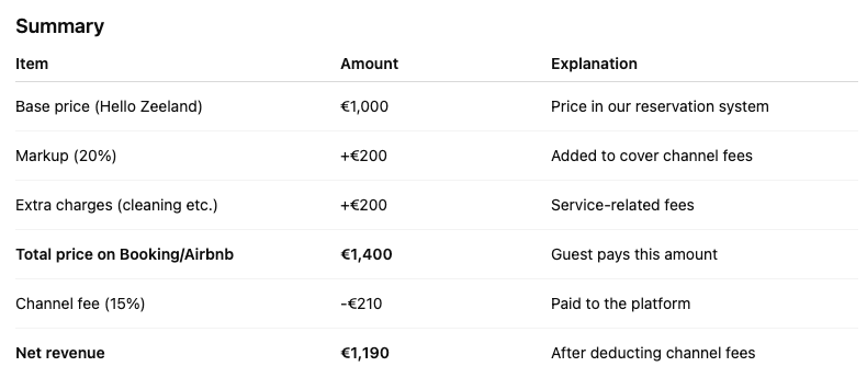 The 20% markup largely covers the channel fees, keeping the net revenue almost equal to a direct booking through Hello Zeeland.